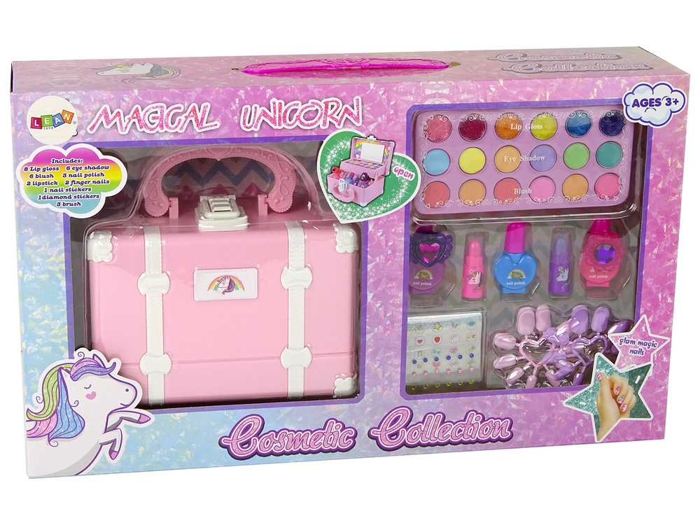 Deze betoverende make up set voor kinderen neemt je kleintjes mee in de wereld van creatieve experimenten met make-up en styling. De doos, gemaakt van duurzaam plastic, is de perfecte plek om alle make-up accessoires op te bergen. De charmante roze kleuren, versierd met een eenhoornmotief, trekken de aandacht en stimuleren de creatieve creatie. Deze make up set voor kinderen bevat een breed scala aan cosmetica waarmee ze prachtige stijlen kunnen creëren. Het biedt niet alleen plezier en vreugde, maar ondersteunt ook de ontwikkeling van artistieke vaardigheden, terwijl het kinderen introduceert in de magische wereld van make-up!