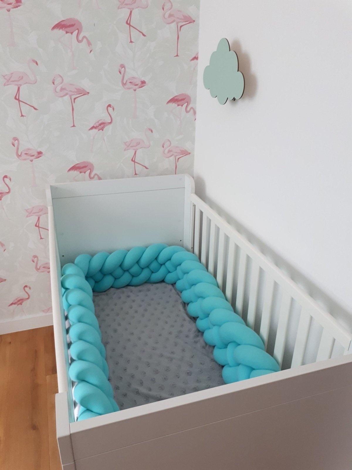 Deze praktische bedbumper combineert veiligheid met gebruiksgemak. De bedbumper is gemaakt van gecertificeerde, kindveilige materialen en is volledig machinewasbaar op 30 graden - ideaal voor dagelijks gebruik. De stevige constructie voorkomt dat het hoofd, de benen of handen van je baby tegen de wieg stoten, wat zorgt voor een veilige nachtrust. Dankzij de combinatie van zachte katoen en duurzame polyester vezelvulling blijft de bedbumper ook na veelvuldig wassen in goede staat. Deze veelzijdige bumper kan ook worden gebruikt als deurstopper of knot cushion, wat hem extra praktisch maakt voor verschillende situaties in huis.